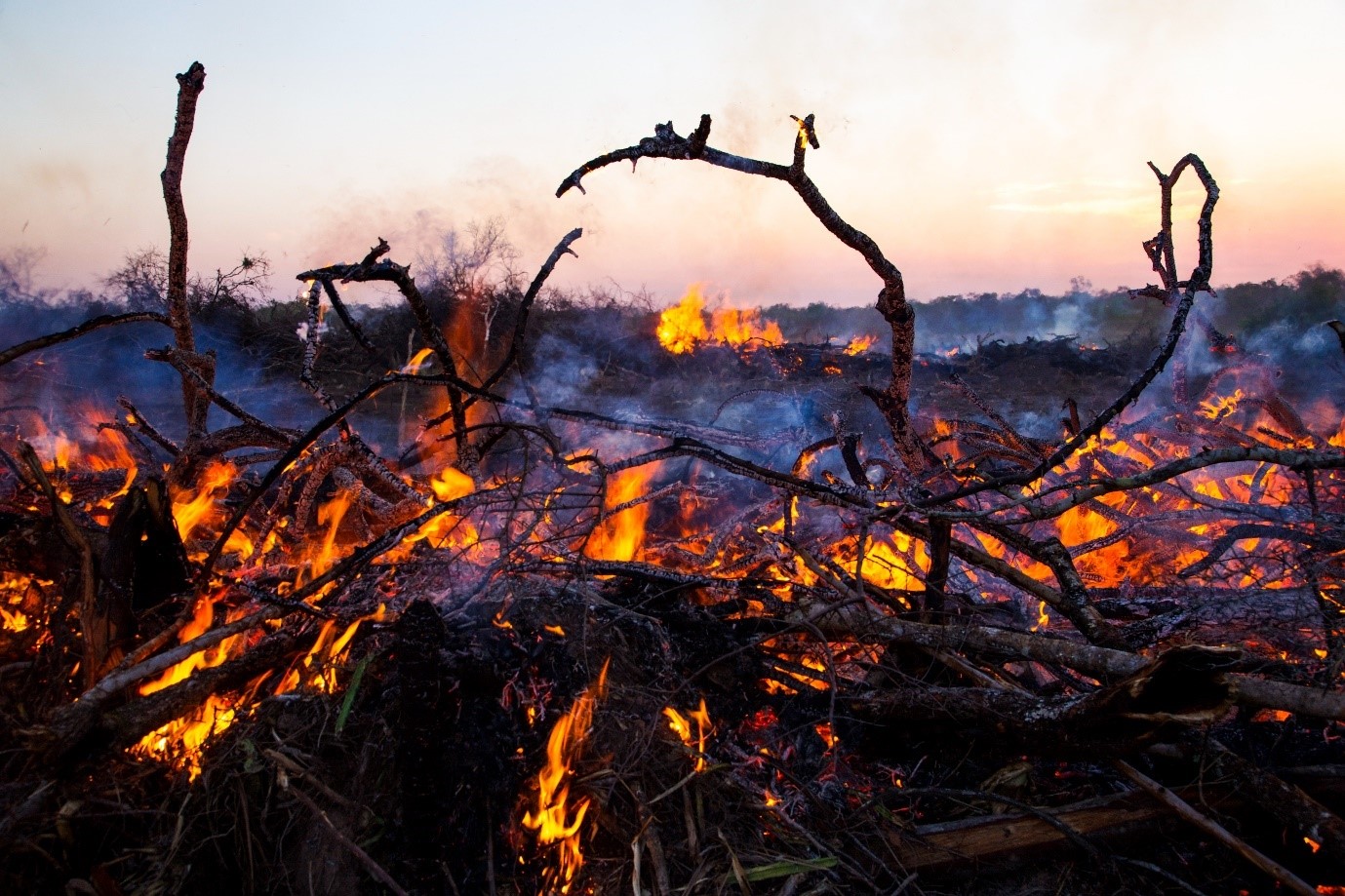 Fires burn on logs cleared from Cerrado forest, Santa Cruz, Bolivia