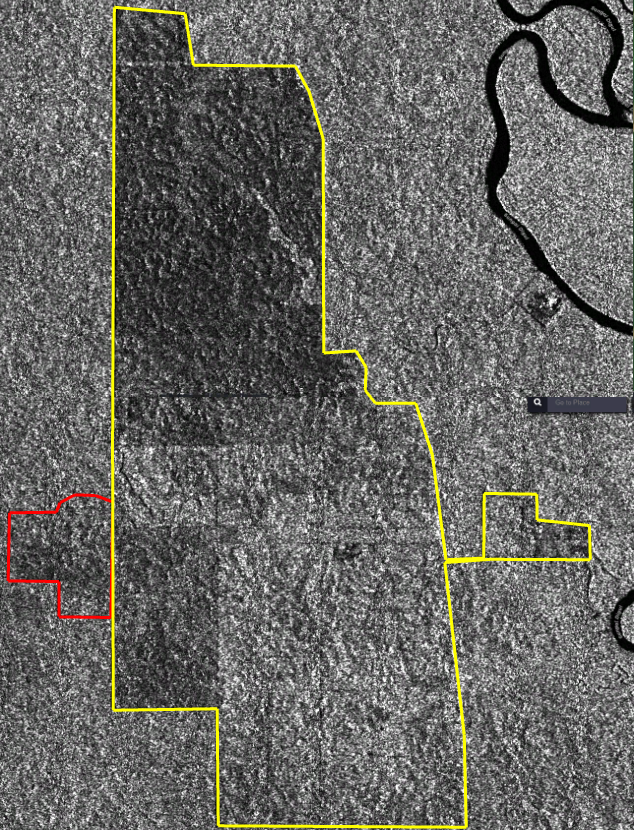 Satellite Image (10 July 2019) with yellow line showing clearance in the PIL concessions up to January 2019. Red line denotes fresh clearance in PT MJR between May and July 2019.