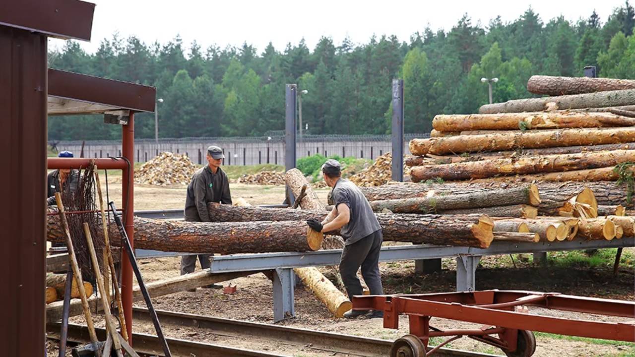 Prisoners preparing logs for sawing at IK-22 in Belarus, 2017.