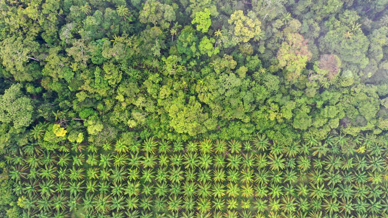 Palm oil plantation at rainforest edge. Malaysia.