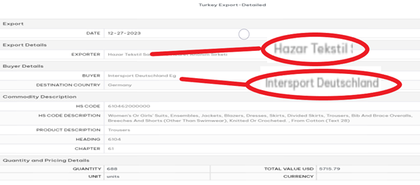 One such record shows a shipment of 688 pairs of women’s cotton trousers, shipped by Hazar to Intersport Deutschland on 23rd December 2023 (see below). In total Hazar shipped Intersport 74,497 garments last year, with a retail value likely in excess of €5 million.