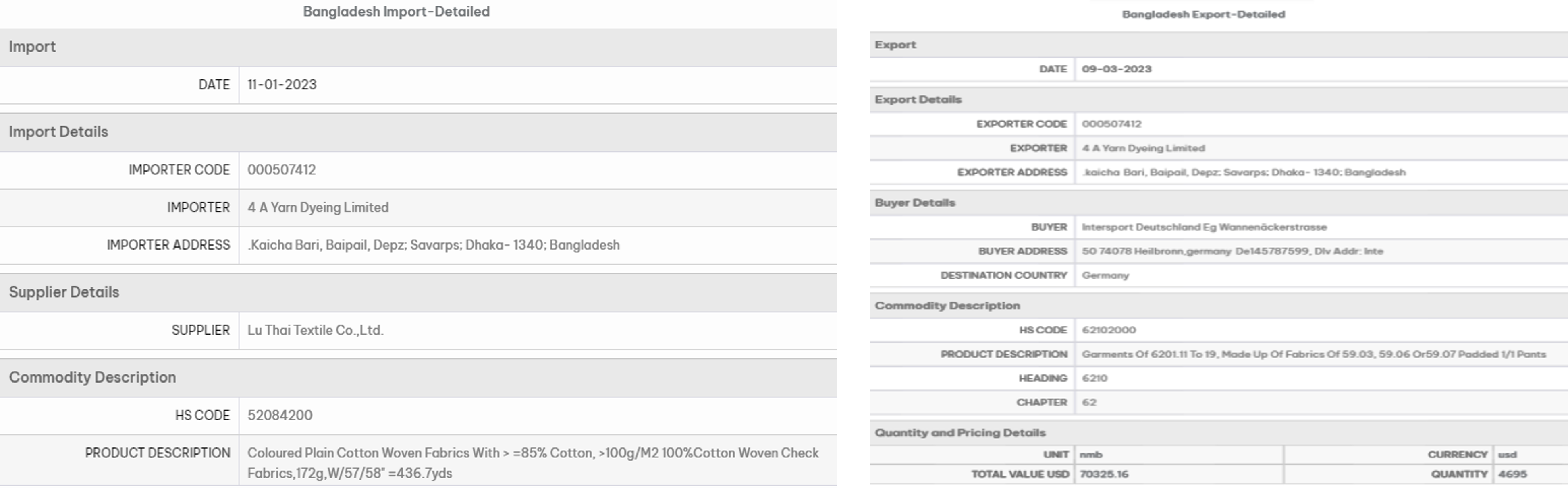 Customs records showing imports of cotton cloth by 4 A Yarn Dyeing in Bangladesh from Lu Thai Textile in China, and exports of finished clothing by 4 A Yarn to Intersport Deutschland, in 2023
