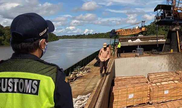 The sawmill, intended to process the estimated $6 billion of timber expected to be produced from the clearance of the land, is owned by a notorious Malaysian logging and plantation multinational, Shin Yang. With its production lines back up and running, in the summer of 2021 it celebrated its first ever shipment. A barge loaded with 1396 cubic meters of veneer worth $1 million slipped anchor on June 7, destined for Shin Yang’s giant parent mill in its home country, to be made into plywood for sale across the world. The local customs agency, far from preventing its departure, actually celebrated it on its website. The local customs chief told reporters he expected the shipment to be the first of many, and for it soon to be followed by loads of palm oil.
