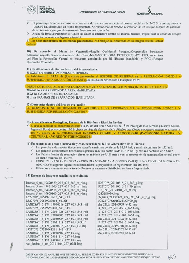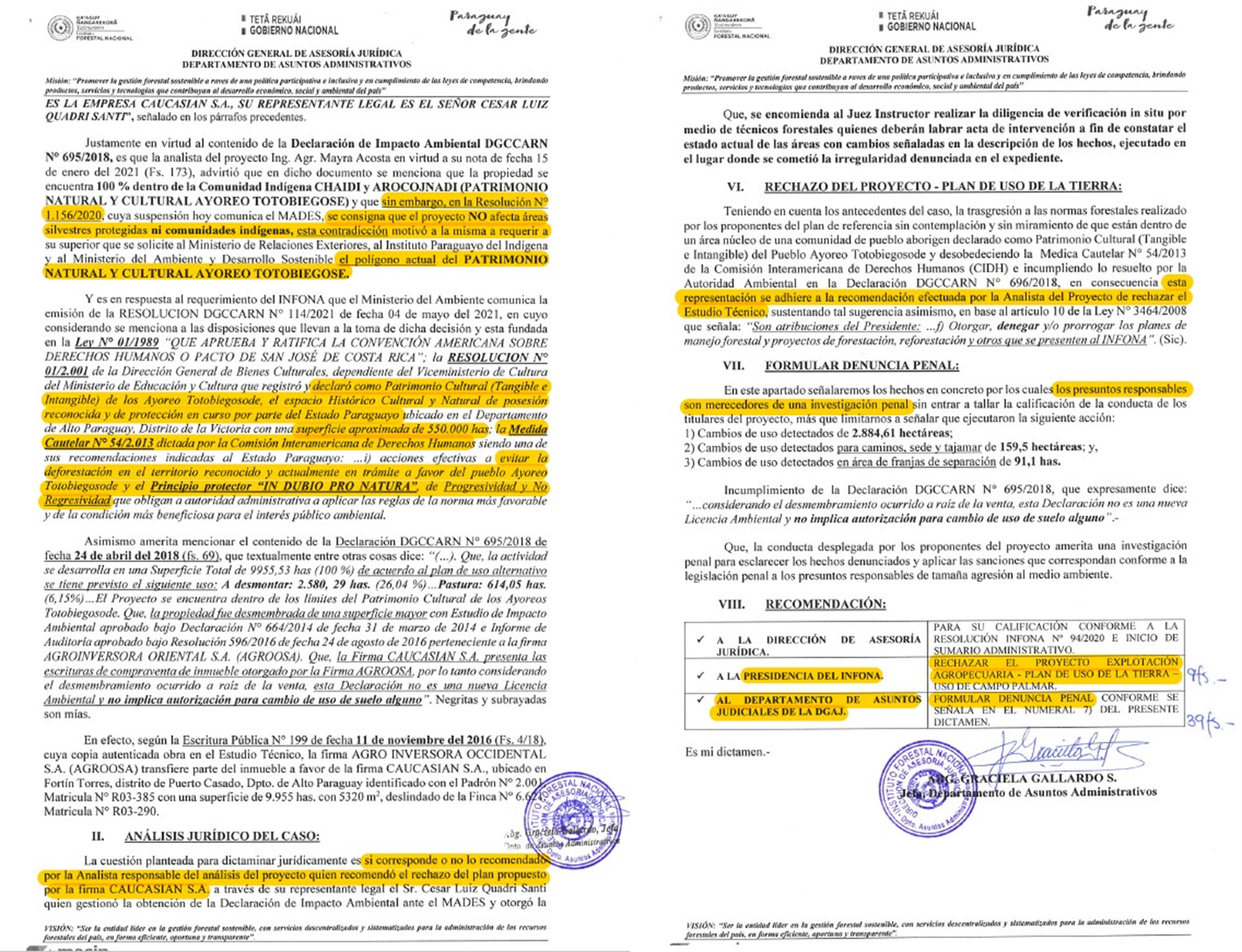Mades’ 2020 decision is made all the more troubling considering the ministry knew of the Inter-American Commission of Human Rights’ (IACHR) precautionary measures issued in 2016 calling on the government to protect PNCAT from further land clearances. In fact, an Infona analyst drew attention to these measures, as well as the government’s own resolutions on the protection of PNCAT, to recommend the agency reject Caucasian’s plan. Sadly, this recommendation only came in January 2021, more than two years after the firm’s submission and after Mades had already approved its audit. The analyst’s recommendation highlighted another worrying revelation: in approving Caucasian’s audit in 2020 Mades falsely stated the farm did not affect protected areas or indigenous communities.