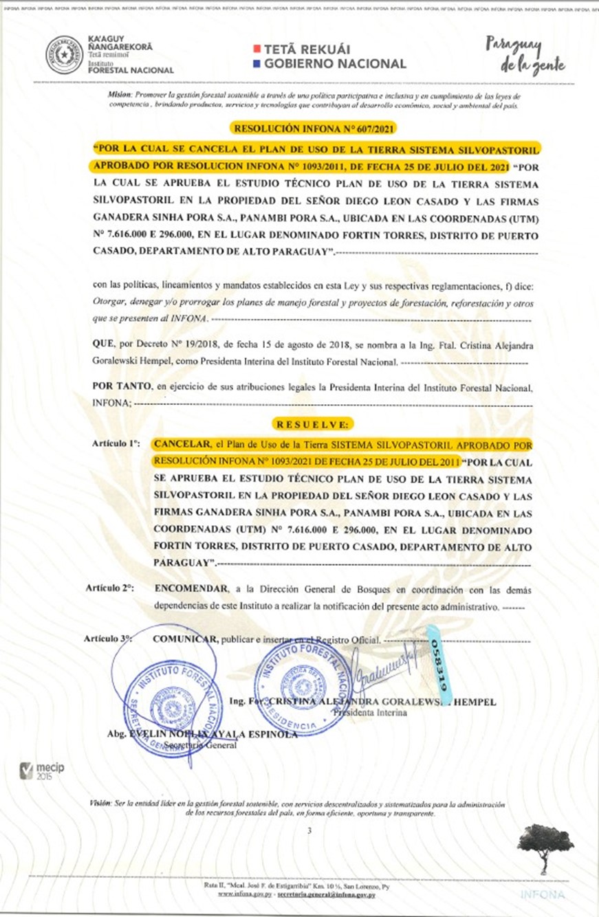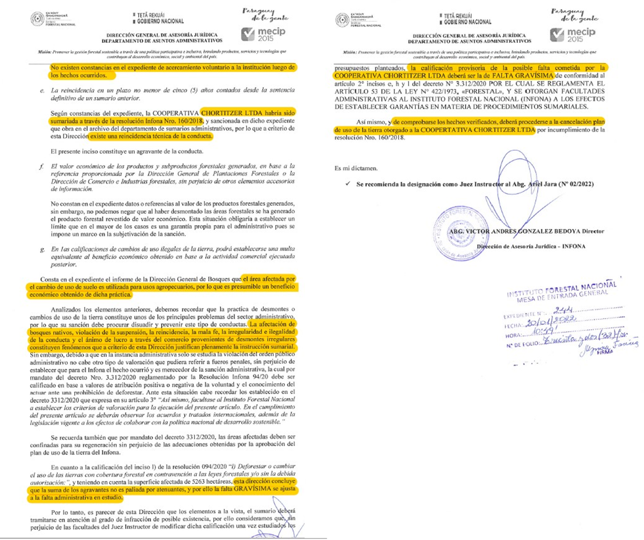 When it comes to Chortitzer things get even murkier. The reasons why are not hard to surmise. Again, Infona had knowledge of Chortitzer’s wrongdoing from an early stage. In February 2018 it suspended the ranch’s PUT following illegal clearances, although the agency’s documents are unclear about the extent of the deforestation identified by its officials. Nonetheless, it was not until nearly three years later, in January 2022, that Infona finally recommended the cancellation of Chortitzer’s plan following further illegal clearances of 526ha between 2018 and 2020 at PNCAT.In the meantime, neither Infona nor Mades showed the slightest apprehension about associating themselves with Chortitzer. In late 2020 Mades signed a cooperation agreement with Chortitzer and Fecoprod, a cooperatives’ association. In early 2021 Infona followed with a cooperation agreement with Chortitzer. Marking the occasion, Infona’s president Cristina Goralewski publicly referred to the company as a “faithful example of sustainable development.” The agreement text went as far as declaring that Chortitzer is “committed to complying with current environmental laws.”
