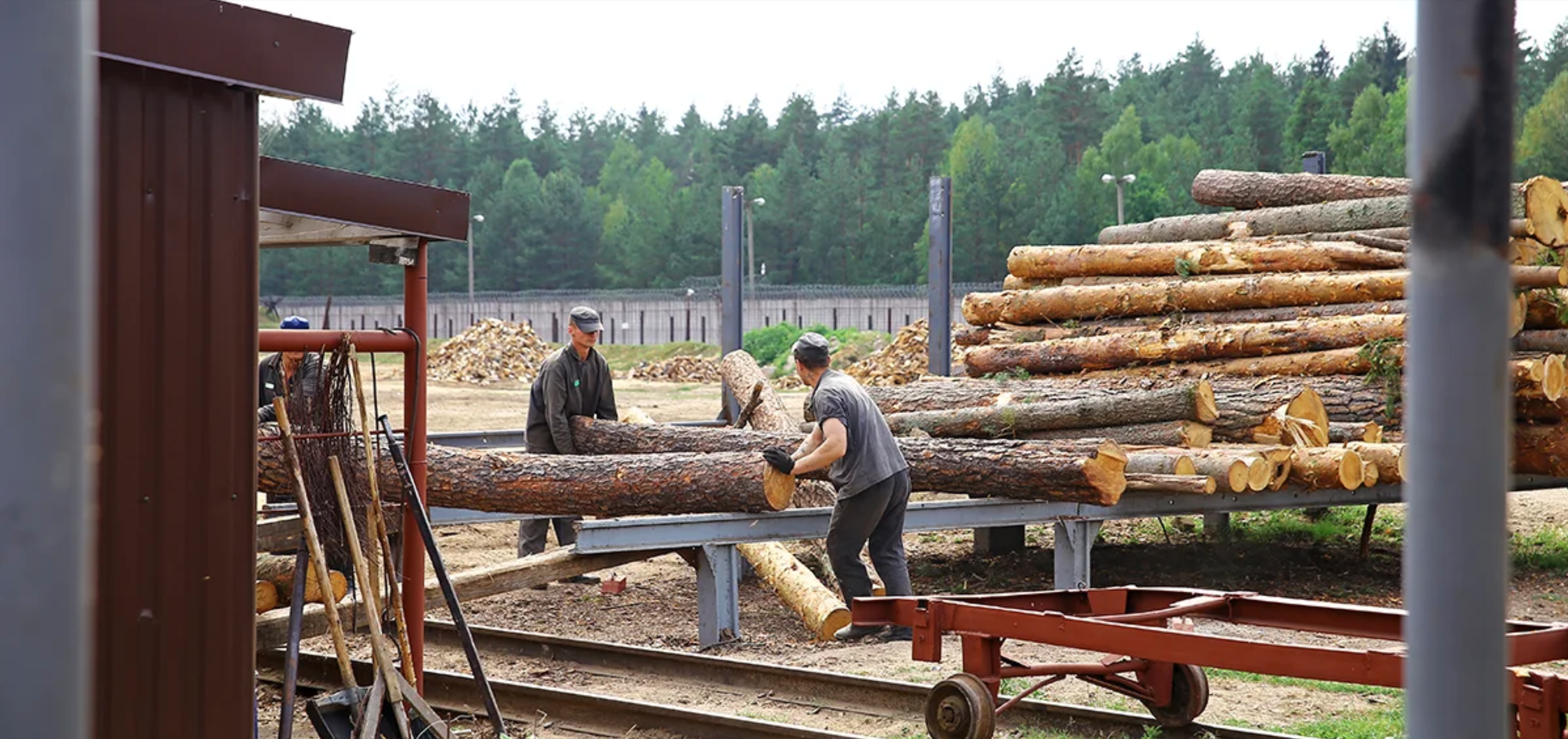 Prisoners preparing logs for sawing at IK-22 in Belarus, 2017