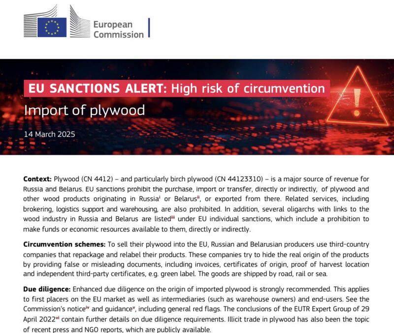 [The EU Parliament] “Calls on the Commission and the Member States to develop broader sanctions on Russian and Belarusian wood, including specifically prohibiting the import or purchase of wood products processed in non-EU countries that incorporate wood, particularly birch plywood, originating in Russia or Belarus, to support the enforcement of current sanctions”