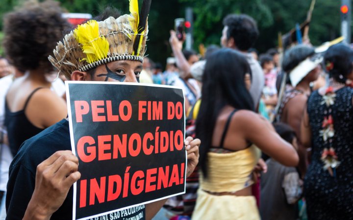 Indigenous man with banner reading "for the end of the indigenous genocide" at a protest for the rights of indigenous people in São Paulo, Brazil.