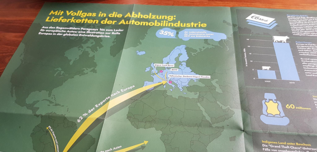 It details the process in which forest illegally cleared on a protected indigenous reserve to raise cattle sets off a chain of events that ultimately sees the leather derived from this production end up in the supply chains of major European car firms.