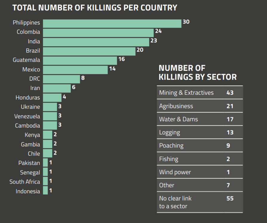 The Philippines saw the highest per country figures. 30 deaths – half of which were linked to agribusiness – were recorded last year.