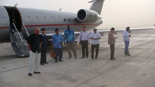 Pictures on Jeremie Issamou’s personal Facebook document the history of palm oil development in the Republic of Congo. In this image, multi-millionaire Malaysian palm oil investors touring Congo by private plane, 2009.