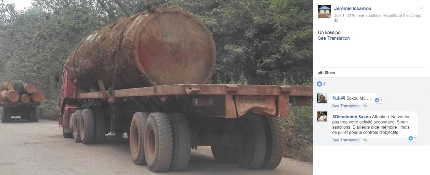 The Director General of Lexus Agric is a man called Jeremie Issamou, who until 2015 was also the Assistant Director General at Atama. Issamou has played an important role in bringing big palm oil investment to the country. Pictures from 2009 show him travelling by private jet across Congo with Malaysian investors, in advance of the conclusion of the Atama contract. In June 2016, while both Atama and Lexus were busy logging illegally, Issamou posted a picture of a giant log on the back of a truck on his Facebook page. The log appears to carry the markings of Atama. A Facebook friend commented, saying (in French) “Be careful. Don’t brag too much about your secondary activity. Otherwise sanctions. Moreover, aide-Memoire: July for objective control”.