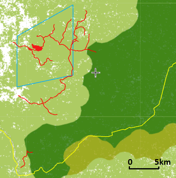 Figure 4: Logging roads (red) cut by Lexus Agric, including outside the boundaries of the company’s 5,000 hectares deforestation permit (blue box), and extending by Jan 2018 into areas of intact forest landscape (dark green)