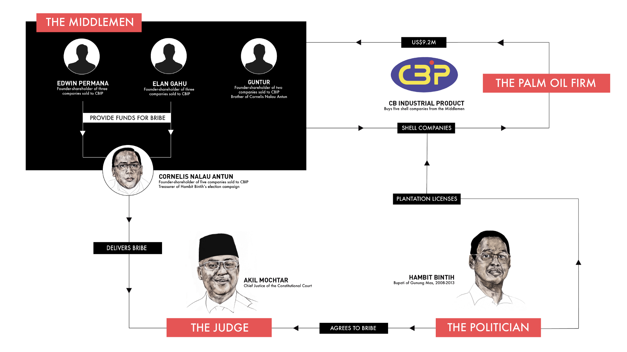 Our second major investigation revealed how the money used to bribe Akil Mochtar, the then-chief justice of Indonesia’s Constitutional Court, to decide an election in favour of an incumbent bupati from Borneo, flowed directly from a deal for plantation permits involving a Malaysian firm.
