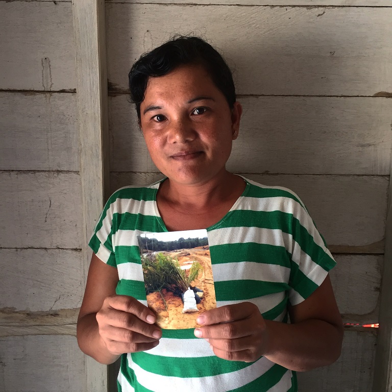 Erma Kusmini with a photo of the land once occupied by her family’s forest farm, now destroyed.