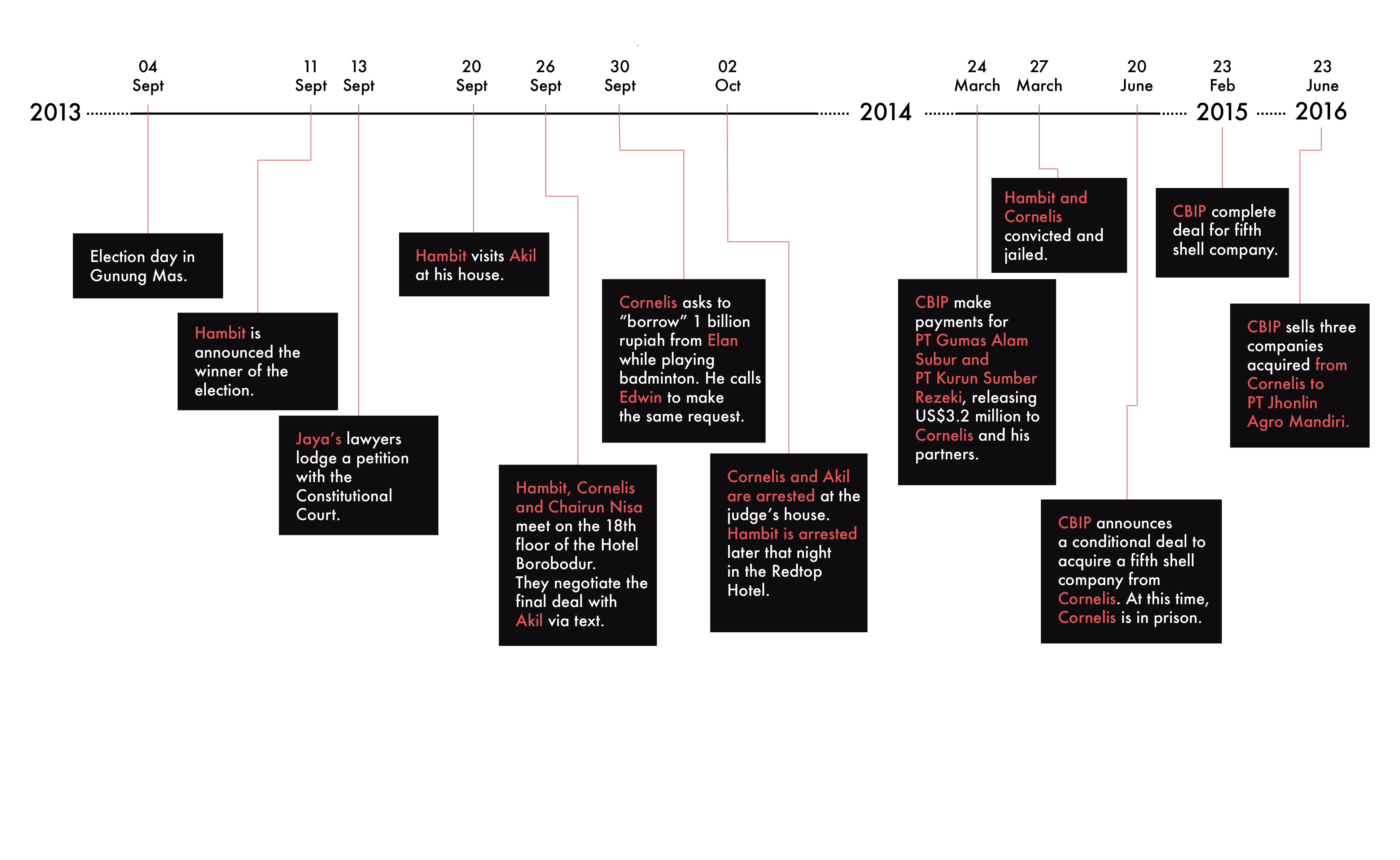 Timeline from election day to the conviction of Hambit and Cornelis. CBIP’s business with Cornelis continued after his imprisonment.