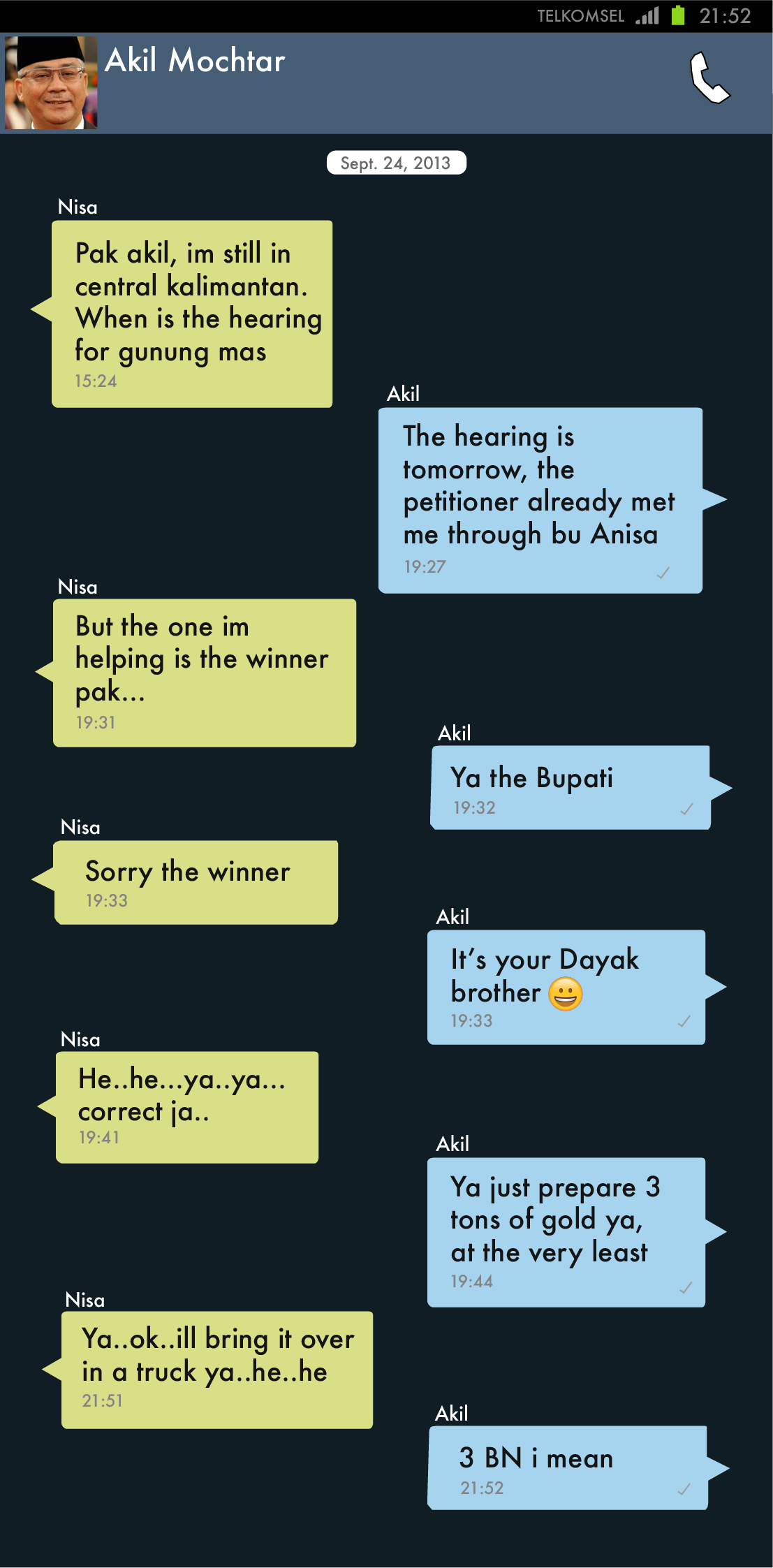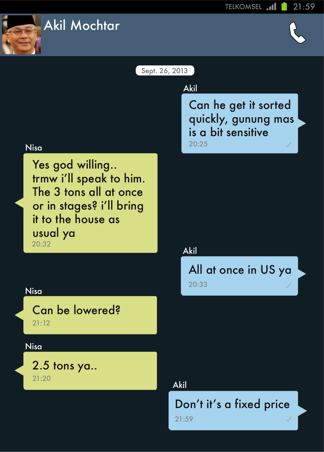 Text messages between Akil Mochtar and Chairun Nisa as she sat with Hambit and Cornelis in the Hotel Borobudur, finalising the deal.