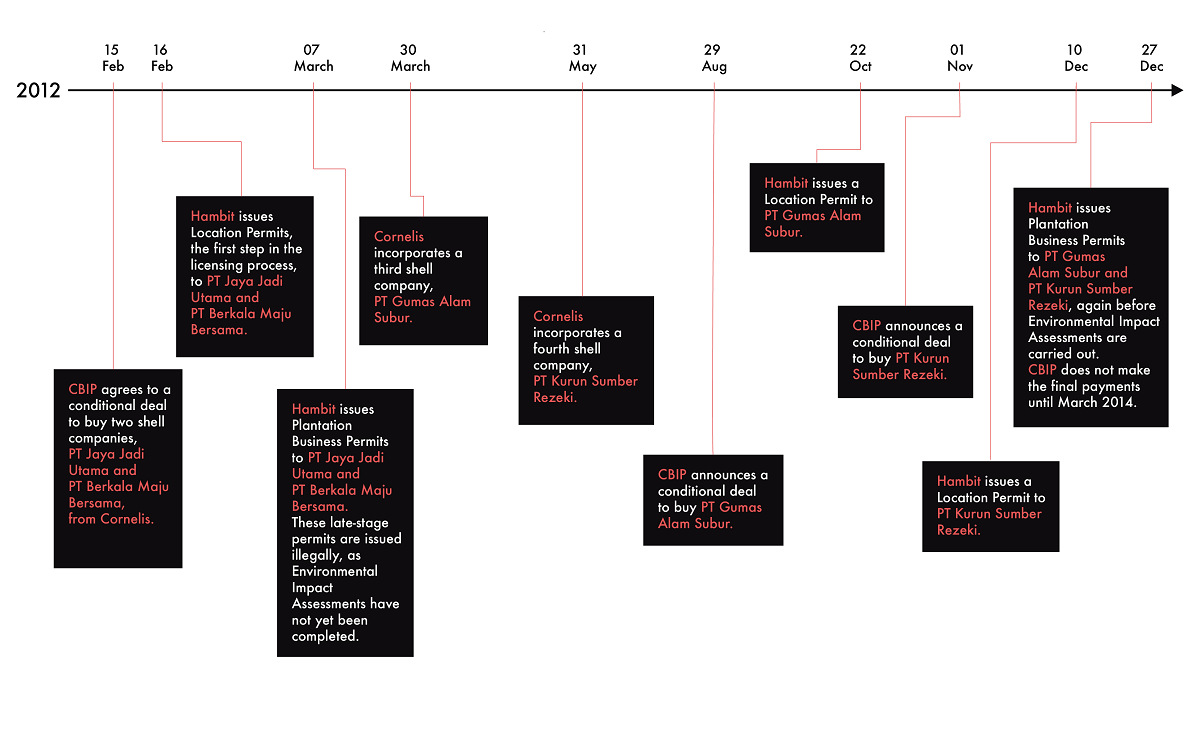 By the beginning of 2012, all the pieces were in place. Cornelis and his partners had set up the shell companies, Hambit was ready to issue the licenses and CBIP was prepared to buy them. The partners drew clear roles. Elan would handle administrative duties. Edwin would oversee the logistics of clearing dense rainforests. Cornelis would deal with their political patron.