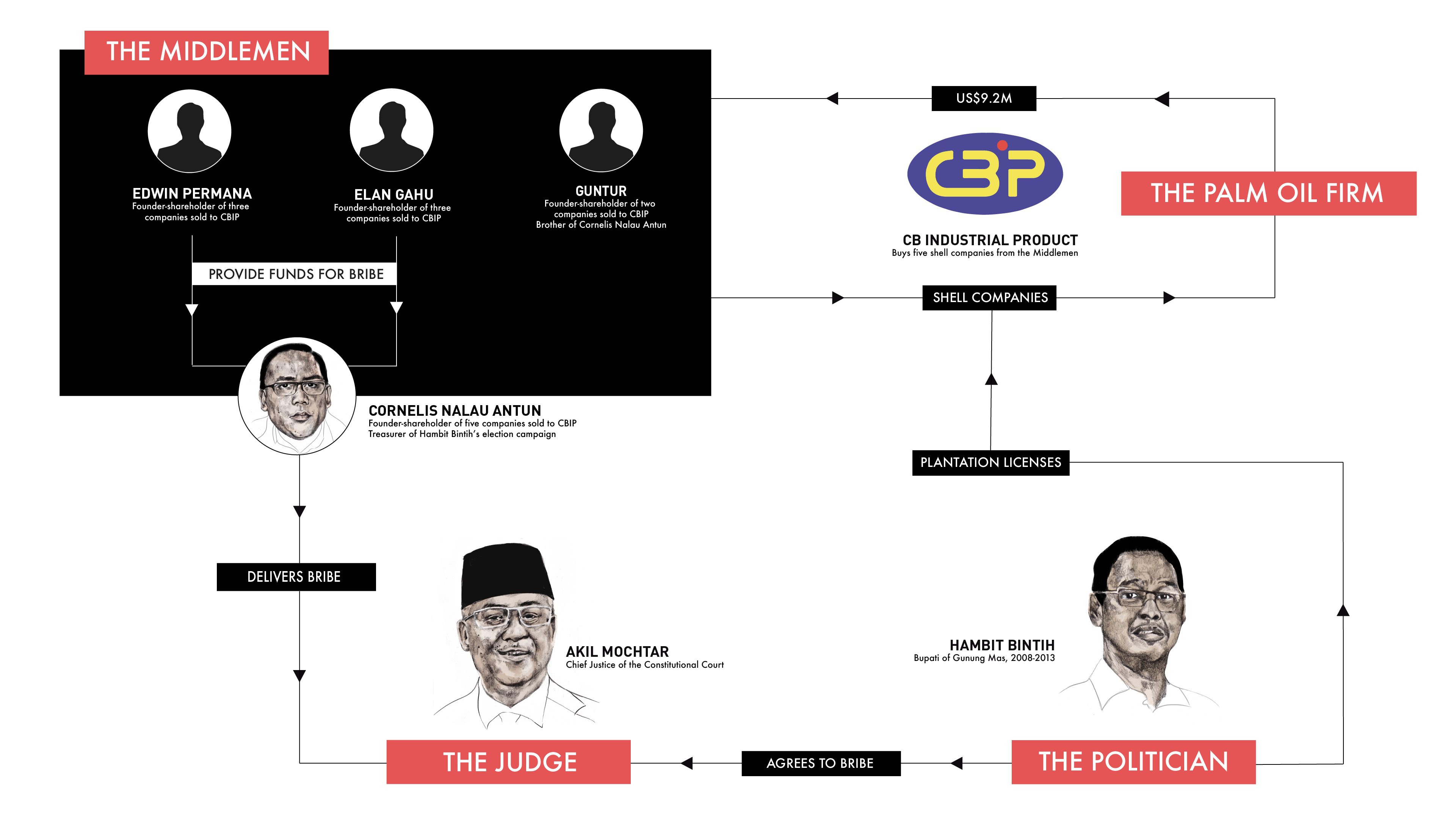 The KPK was too busy following the other leads of bribery out from Akil to push the investigation further. In any case, the charges against Hambit were easily proven through a multitude of text messages exposing his negotiations with the judge, while Cornelis had been caught red-handed. The source of the money was attributed to the largesse of two wealthy men willing to help out a friend, no questions asked. Hambit and Cornelis were sentenced to four and three years in prison respectively. Akil was convicted in a separate trial and sent away for life, bringing the episode to a close. But a deeper story remained untold.