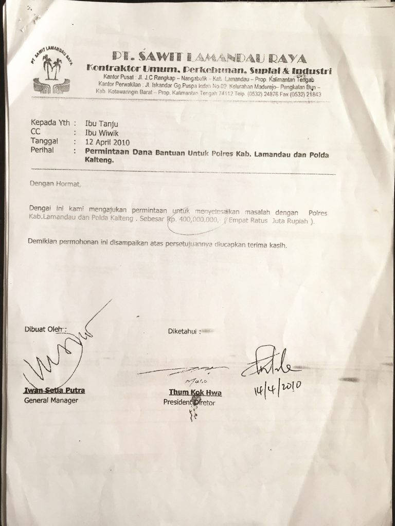 A letter from the general manager of CBIP’s Lamandau subsidiary requesting funds to “solve the problem” with the police.