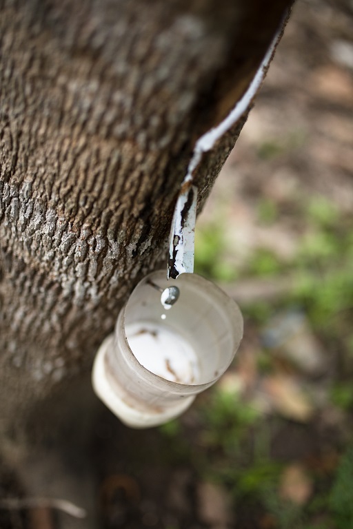 A cup attached to a rubber tree collects latex in Gunung Mas. Tapping rubber is an important source of income for the people of the district.