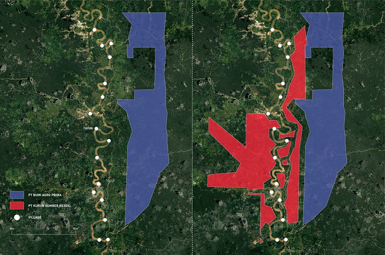 Where the first concession in Tuyun began five kilometers (three miles) from the villages, but in their farmland, a second one swallowed all of their land and the villages themselves. In all, six new licenses, handed out in the last 19 months of Hambit’s term in office, threatened to subsume dozens of villages strung along the Kahayan River and its tributary the Rungan. If developed, they would leave thousands of residents with just a few hundred meters of farmland between their homes and the start of the oil palm.