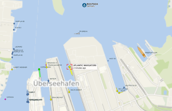 Location of the vessel in Rostock port (Source: Vesselfinder.com - https://www.vesselfinder.com/?imo=9231145)