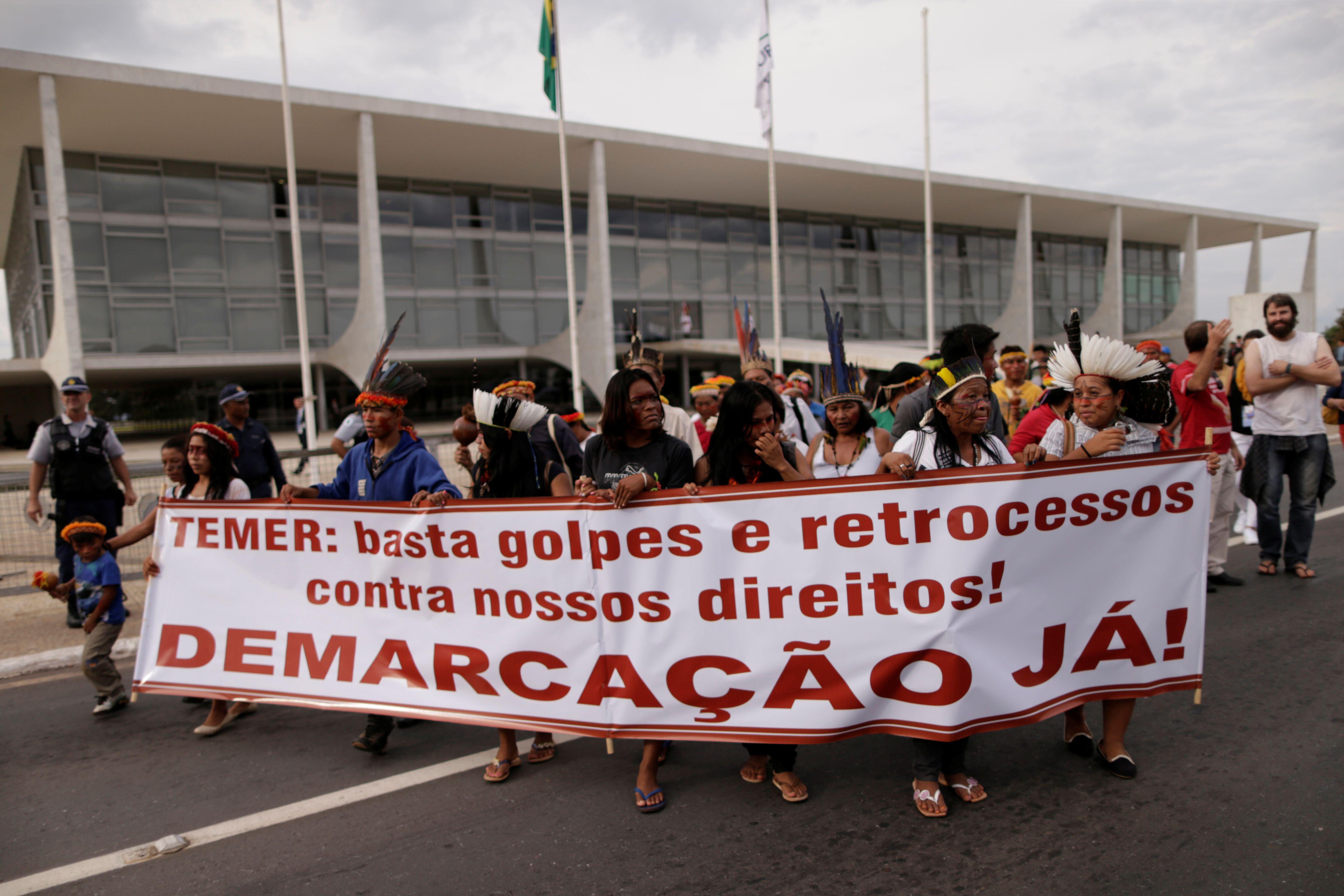 Guarani Kaiowá people protest for the demarcation of their lands in Mato Grosso do Sul. Banner reads "Enough blows and setbacks against our rights! DEMARCATION NOW".
