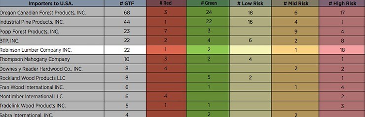The riskiness of Robinson’s Peruvian imports has already been highlighted – though one could be excused for not having noticed. Buried in a damning report on illegality in the Peruvian timber sector published by EIA in 2018 is a table of US importers.